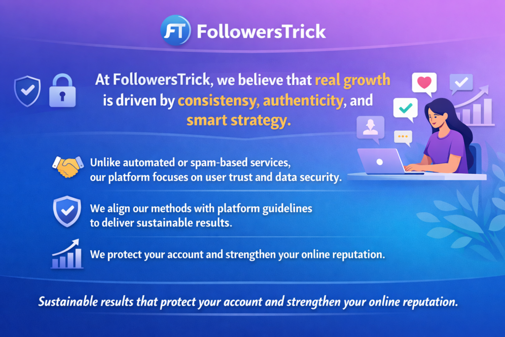 At FollowersTrick, we believe that long-term success comes from consistency, authenticity, and smart strategy. Our platform is built to prioritize user trust and data security, ensuring safe and transparent growth without relying on automated or spam-based methods. By strictly aligning with platform guidelines, we deliver sustainable results that protect your account, enhance engagement, and strengthen your online reputation—helping you grow with confidence.